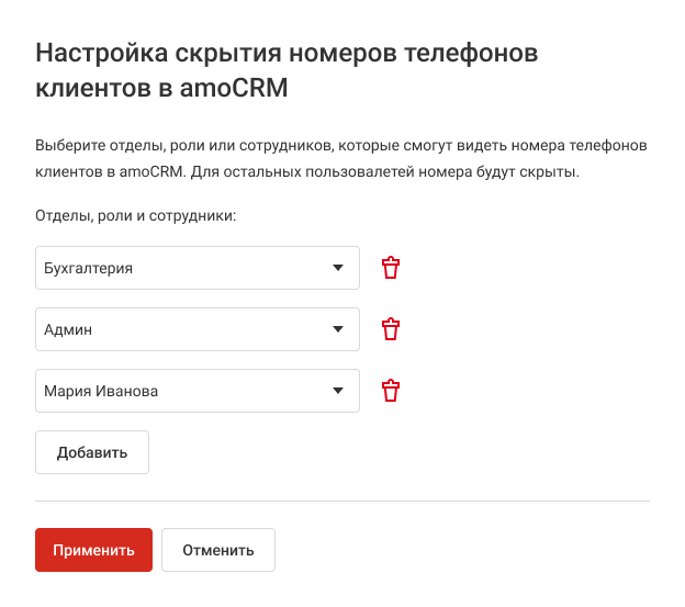 Вы можете скрыть от сотрудников номера телефонов клиентов, чтобы сохранить базу контактов в безопасности, не нарушая рабочий процесс. Номера будут замаскированы с помощью «*”.