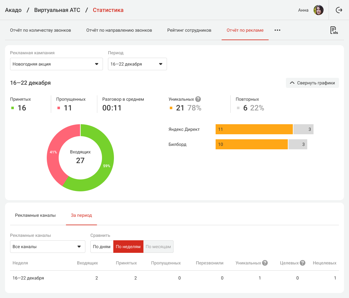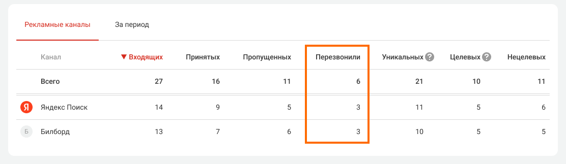По количеству уникальных входящих звонков, поступающих с каждого рекламного канала, вы определите, для какого канала стоит увеличить бюджет, а от какого — отказаться. Также рекомендуем прослушивать входящие звонки на каждый из номеров, чтобы оценить не только количество, но и качество заявок в зависимости от источника трафика.