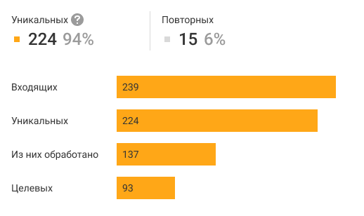 Число уникальных звонков — это количество клиентов, которые вам звонили. Например, за день номер А позвонил в компанию 3 раза, номер Б – 4 раза, значит, всего входящих будет 7, а уникальных звонков и заявок – 2.
