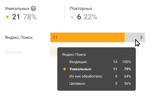 У вас может быть много номеров для разных рекламных каналов. На диаграмме справа вы сможете легко сопоставить каналы по эффективности, ведь в ней отображается не только число уникальных и целевых звонков, но и их доля среди всех звонков с этого источника трафика.