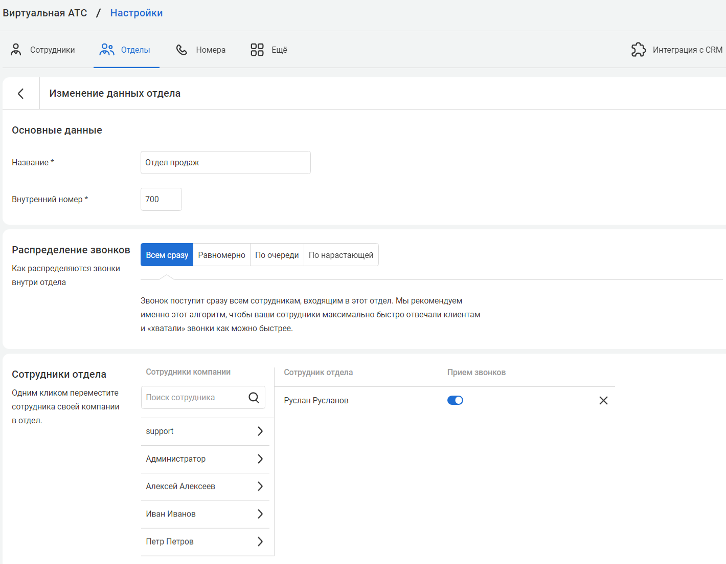 Этого сотрудника необходимо добавить в отдел. Для этого следует в разделе «Отделы» создайте новый отдел (кнопка «Добавить отдел») и в блоке «Сотрудники компании» добавьте сотрудника.