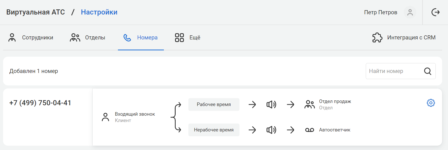 Перейдите в раздел «Номера». Нажмите на текущую схему маршрутизации номера, к которому хотите подключить CRM, чтобы открыть настройки.